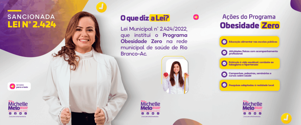 Com mais da metade da população adulta acima do peso, Rio Branco dá um passo decisivo na promoção da saúde pública com a criação do Programa Obesidade Zero, instituído pela Lei nº 2.424/2022, de autoria da então vereadora Dra. Michelle Melo, sancionada em 25 de abril de 2022.