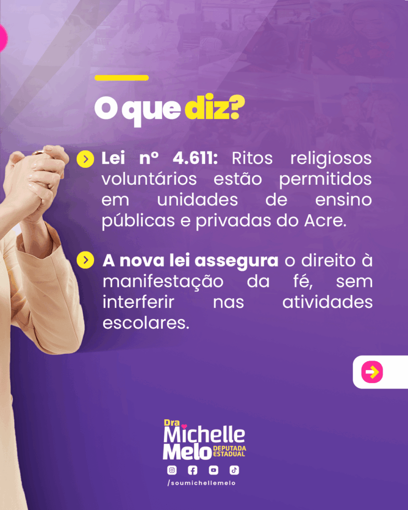 O ciclo se completou em 15 de julho, com a sanção da Lei nº 4.611 pelo Governo do Estado, garantindo oficialmente o direito à realização de ritos religiosos voluntários em escolas públicas e privadas. Mais uma conquista que teve como ponto de partida o trabalho legislativo e o olhar humanizado da Dra. Michelle Melo, que tem se destacado pela defesa firme da liberdade, do respeito e da dignidade de todos os acreanos. Acesse Aqui a Lei
