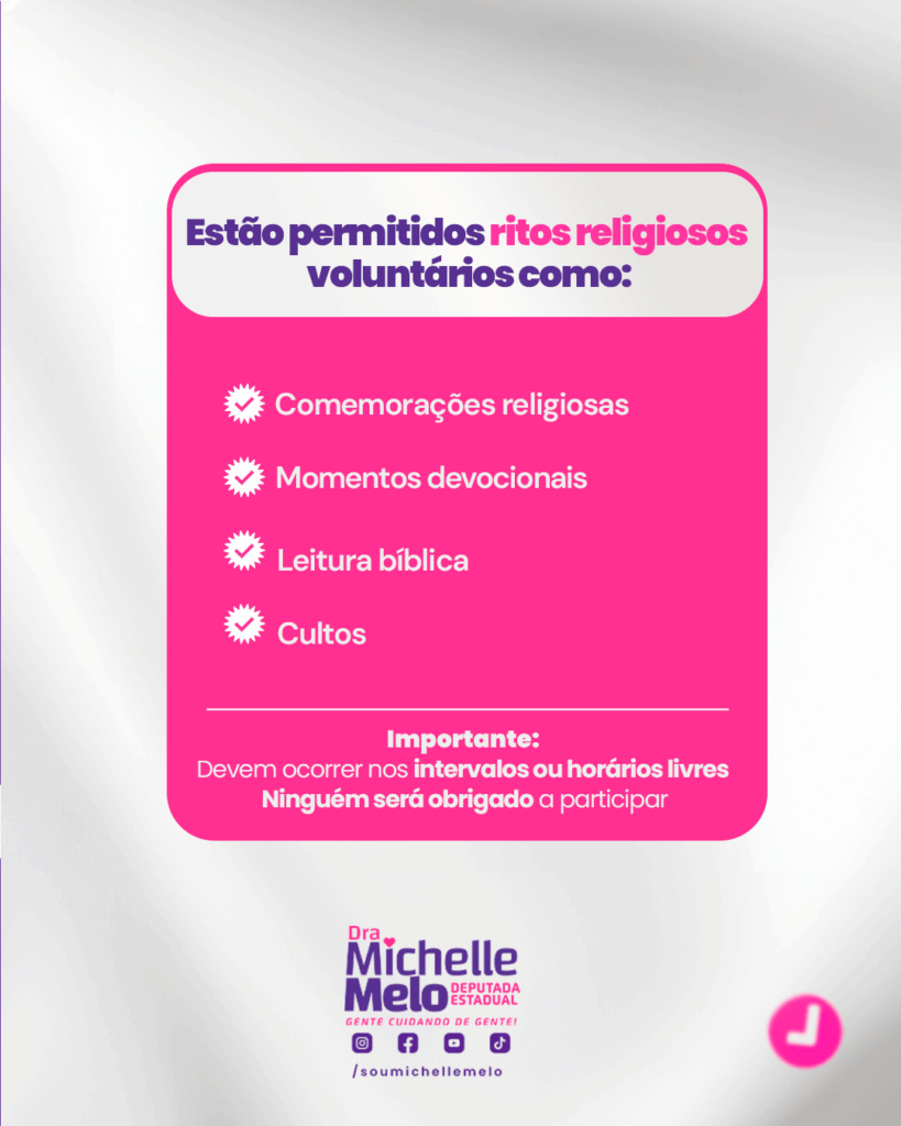A nova legislação permite que práticas como leitura bíblica, cultos, devocionais e comemorações religiosas possam acontecer durante os intervalos ou em horários compatíveis com a rotina escolar. Um ponto importante da lei é o respeito à liberdade individual: nenhum aluno ou servidor será obrigado a participar.